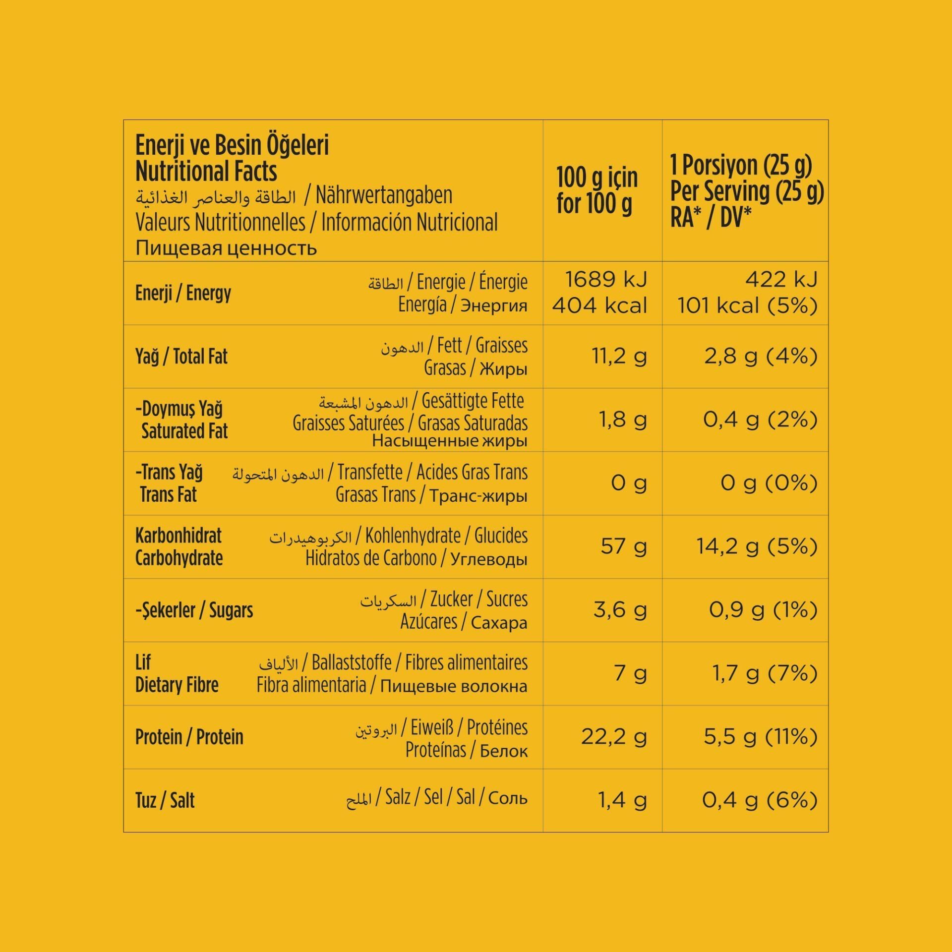 Nohut unu (%38), mercimek unu, sebze yeşillikleri çeşni (%13) [sebze tozları (soğan,sarımsak, maydanoz, fesleğen, kekik, dereotu, kereviz) pirinç nişastası, zerdeçal tozu, maya ekstraktı], ayçiçeği yağı, bezelye proteini, fasulye unu, pirinç unu, tuz.