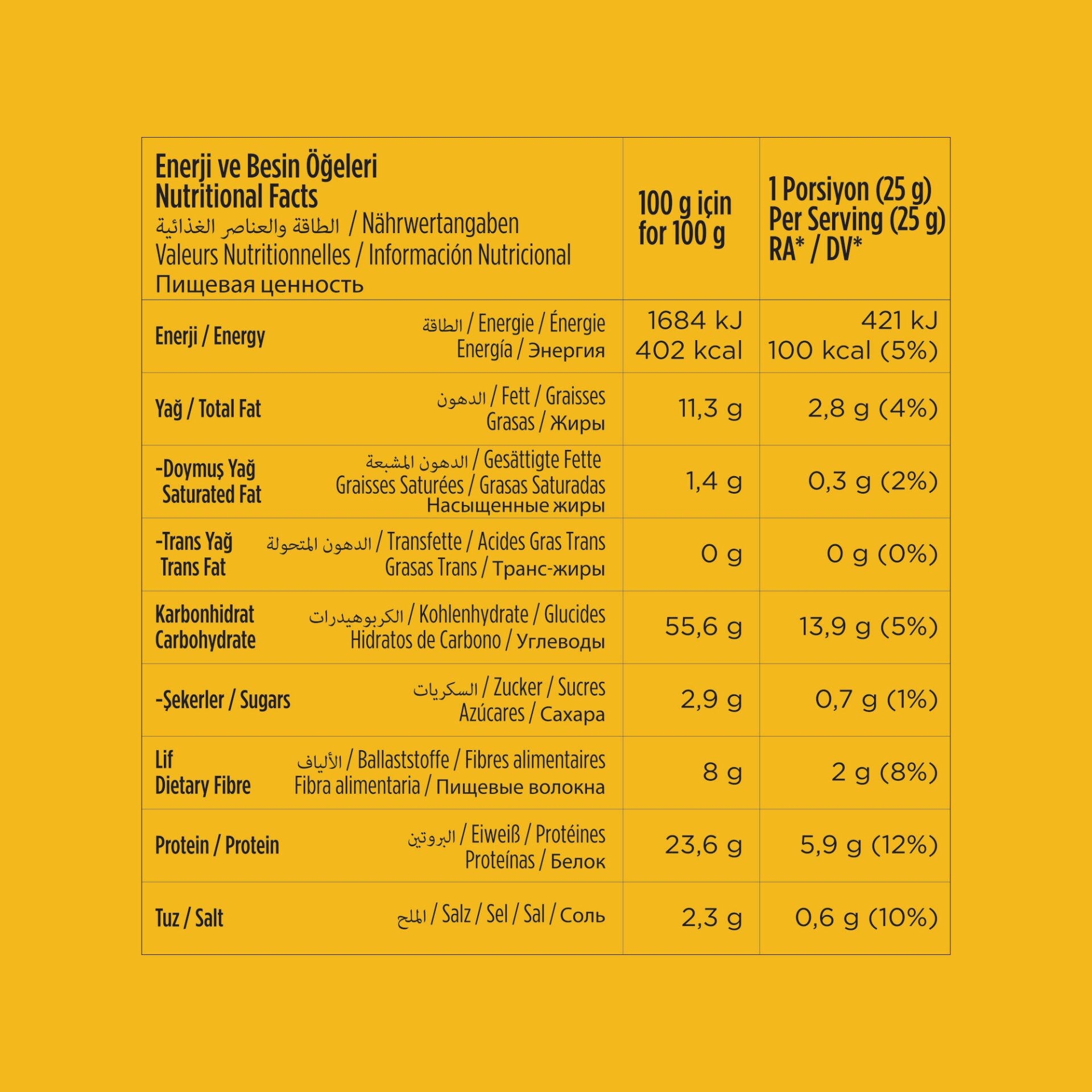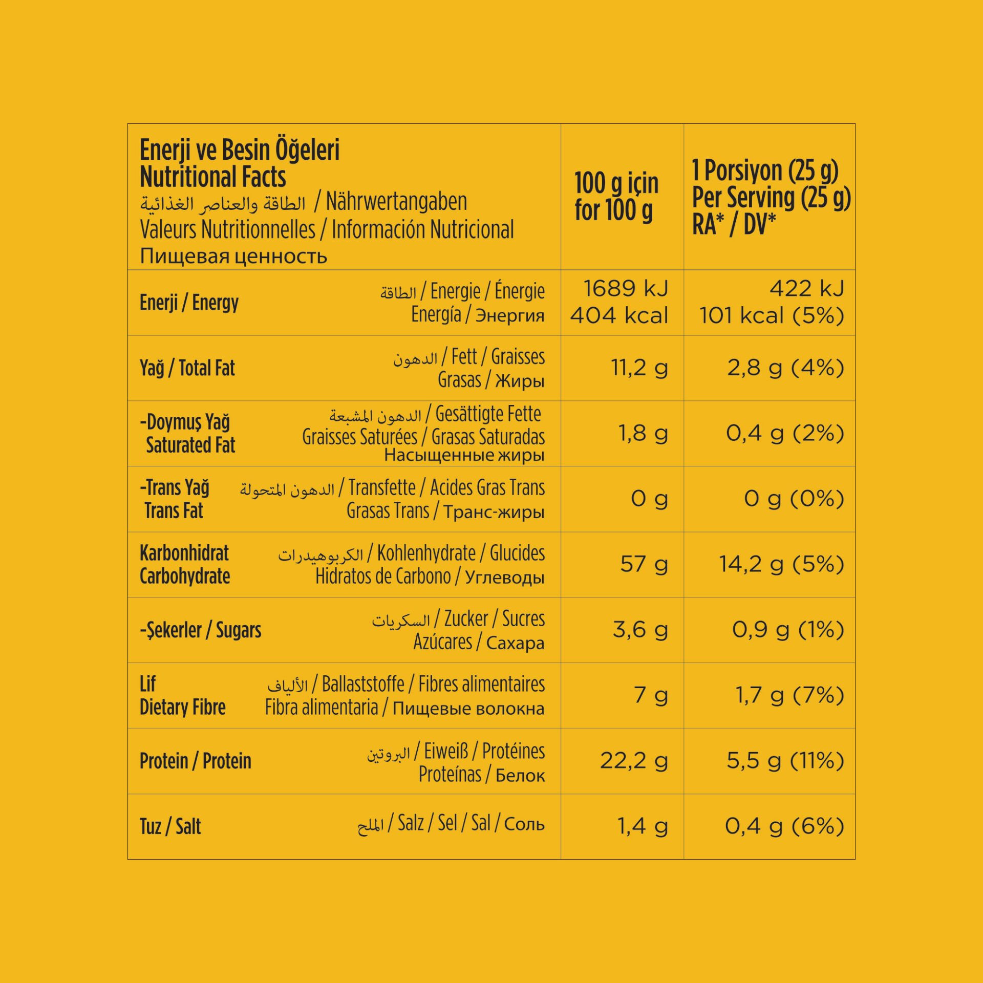 Nohut unu (%38), mercimek unu, sebze yeşillikleri çeşni (%13) [sebze tozları (soğan,sarımsak, maydanoz, fesleğen, kekik, dereotu, kereviz) pirinç nişastası, zerdeçal tozu, maya ekstraktı], ayçiçeği yağı, bezelye proteini, fasulye unu, pirinç unu, tuz.