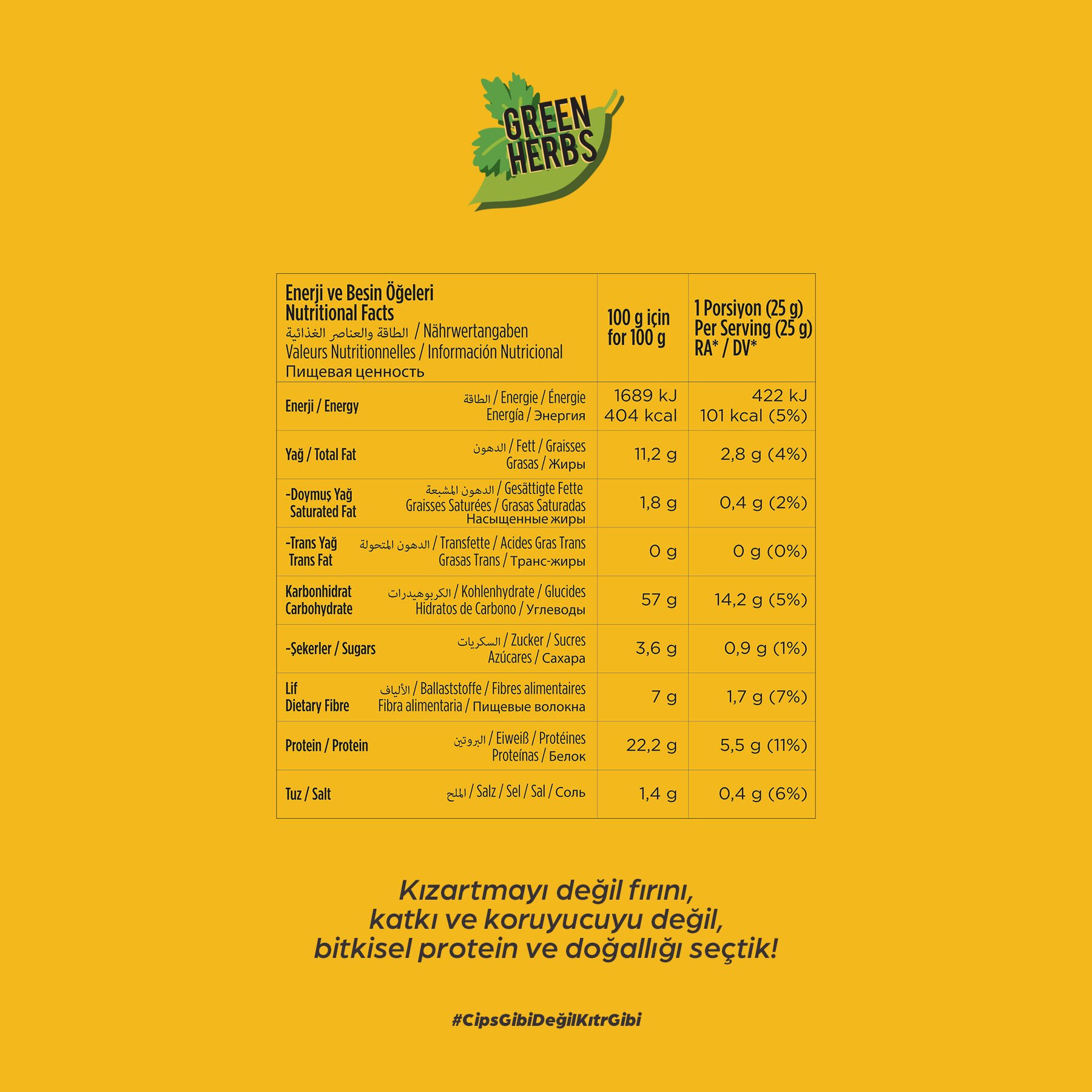 Nohut unu (%38), mercimek unu, sebze yeşillikleri çeşni (%13) [sebze tozları (soğan,sarımsak, maydanoz, fesleğen, kekik, dereotu, kereviz) pirinç nişastası, zerdeçal tozu, maya ekstraktı], ayçiçeği yağı, bezelye proteini, fasulye unu, pirinç unu, tuz.