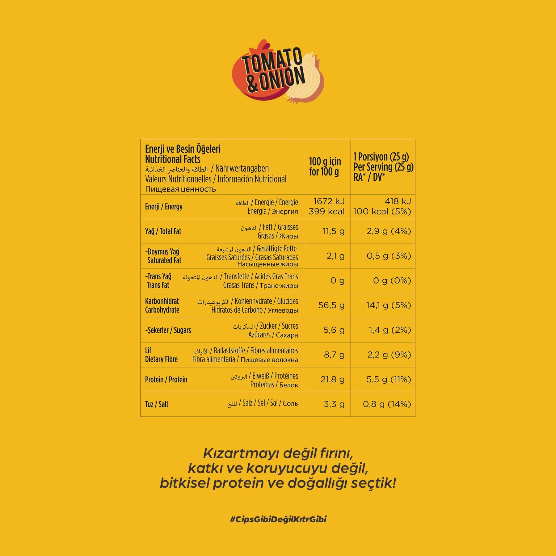 Nohut unu (%38), mercimek unu, sebze yeşillikleri çeşni (%13) [domates tozu,soğan tozu, kırmızı toz biber], ayçiçeği yağı, bezelye proteini, fasulye unu, pirinç unu, tuz.